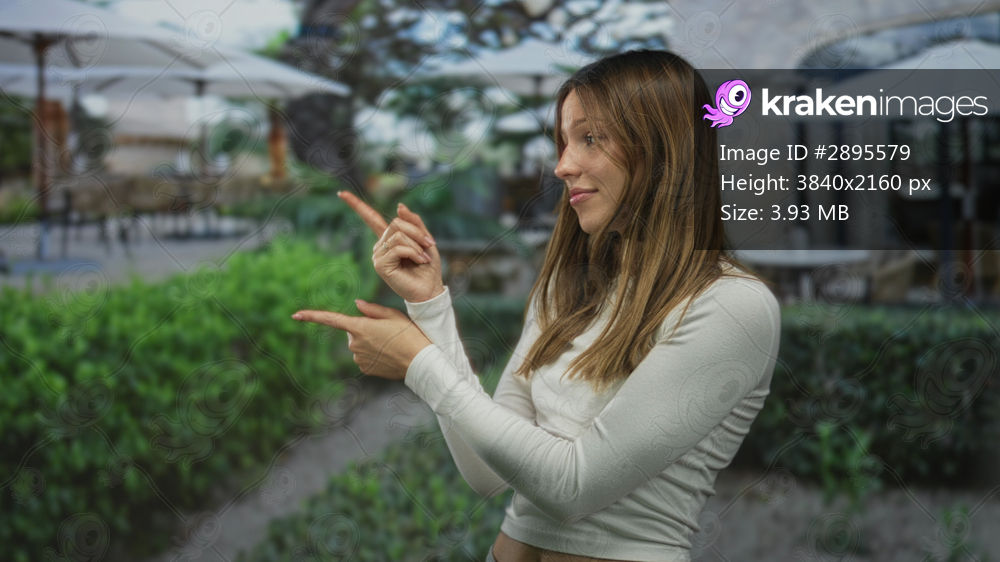Woman points both index fingers to the left on a restaurant terrace outdoors beside patio umbrellas and trimmed hedges; playful suggestion.