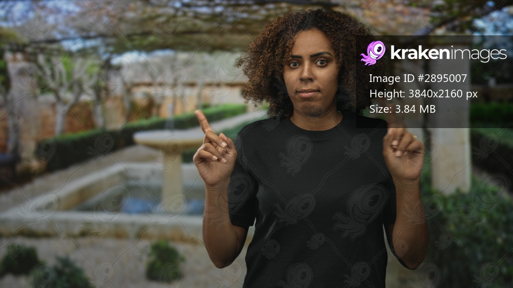 Woman points both index fingers upward beside a stone fountain and pergola columns in an outdoor building courtyard; hesitation.