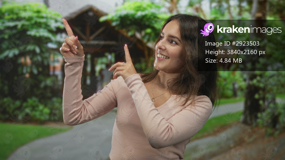 Woman points both index fingers upward by a building entrance surrounded by green park foliage; playful optimism.
