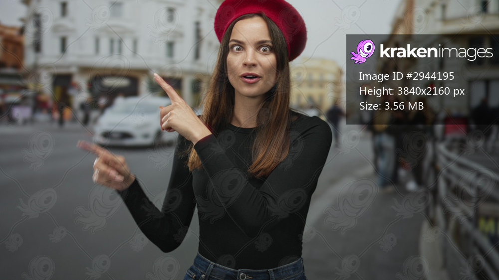 Woman points both index fingers upward on city street wearing red beret and black shirt; surprise curiosity.