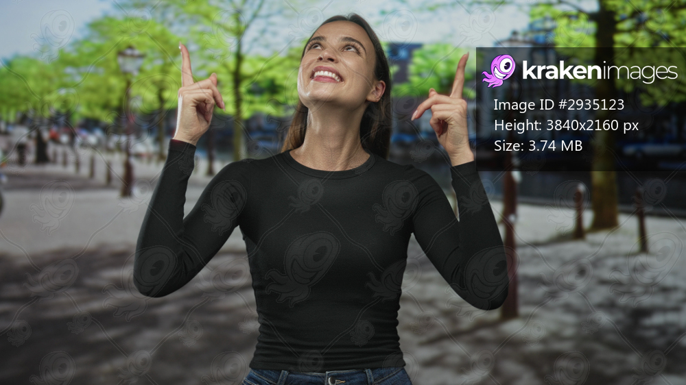 Woman points both index fingers upward on street canal walkway, smiling and looking up at sky; optimism celebration.