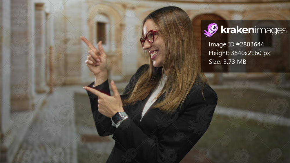 Woman points both index fingers while smiling on an old town street with cobblestones and stone building facades; cheerful confidence.