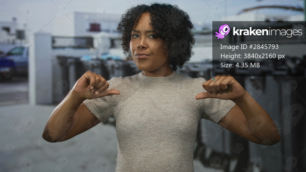 Woman points both thumbs at herself next to a line of recycling containers on a city street; pride.