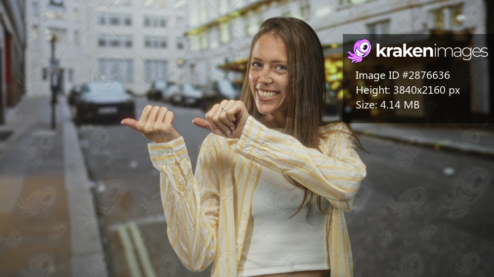Woman points both thumbs backward on street, smiling with cropped top and visible ring on finger; playful confidence.