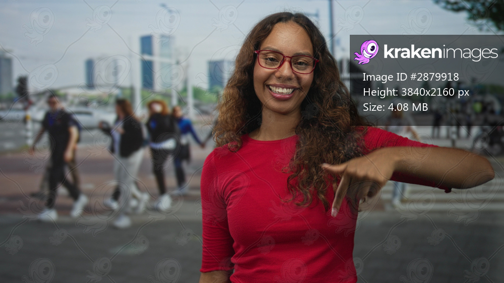 Woman points both thumbs to chest on busy street crosswalk, smiling in red shirt and red glasses, hands and fingers clearly visible; confidence empowerment success. - Kraken Images