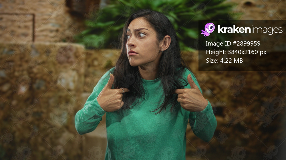 Woman points both thumbs to her chest on old town street with furrowed brow and tense shoulders; confusion questioning blame.
