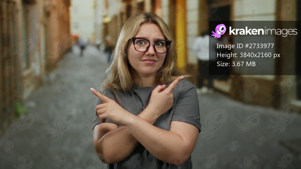 Woman points with confusion on a city street, showcasing urban lifestyle and expression with blonde hair and glasses outdoors during daytime.