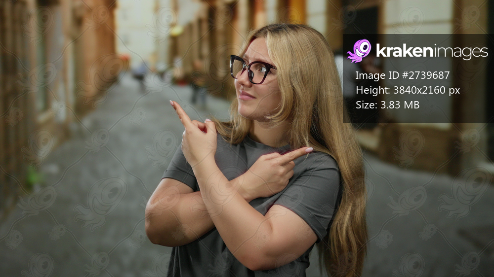 Woman points with confusion on a city street, showcasing urban lifestyle and expression with blonde hair and glasses outdoors during daytime.