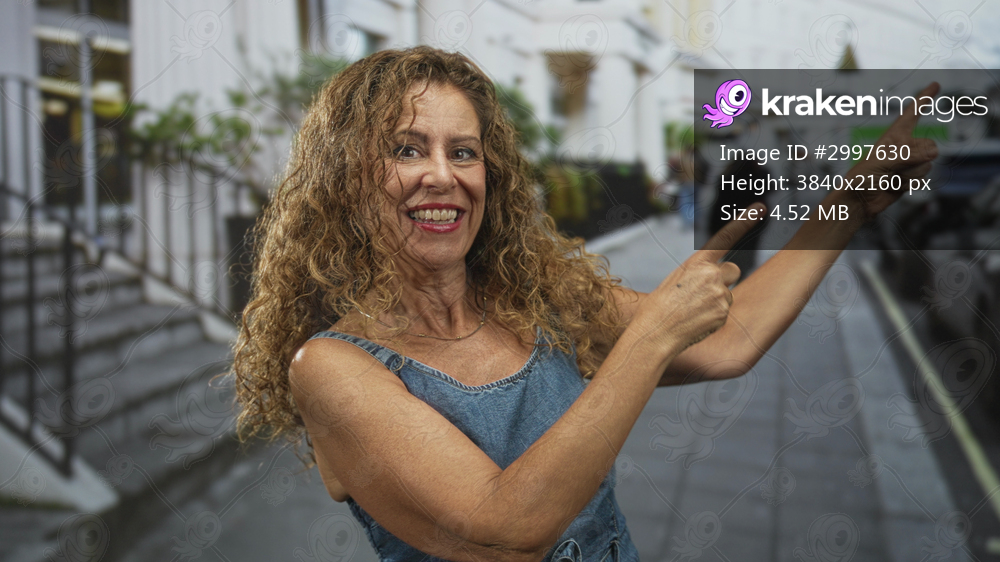 Woman points finger with arms raised and smiling on a city street beside parked cars and steps; playful joy.