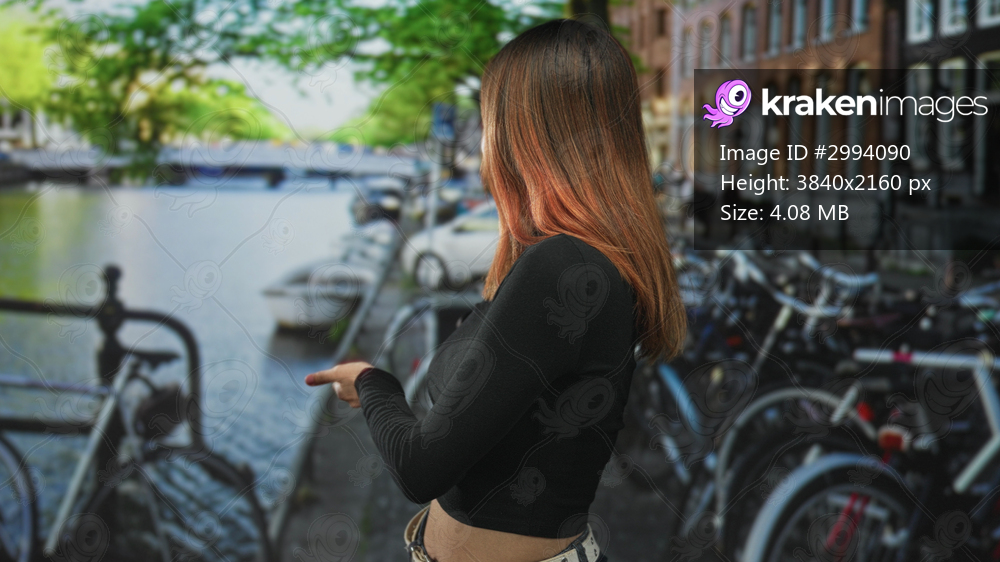 Woman points finger at bicycles by a canal on a street, sideview showing visible hand and black top; curiosity travel exploration.