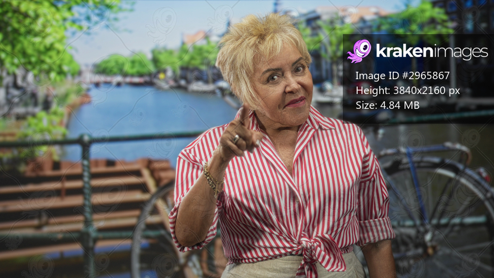 Woman points finger at camera beside bicycle wheel on a canal bridge street, wearing red and white striped shirt tied at waist with stern look; confidence. - Kraken Images