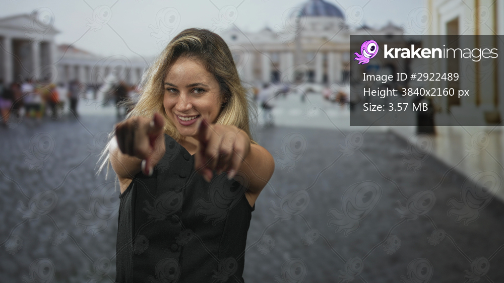 Woman points finger at camera with both hands in square at the vatican, smiling and leaning forward; playful confidence.