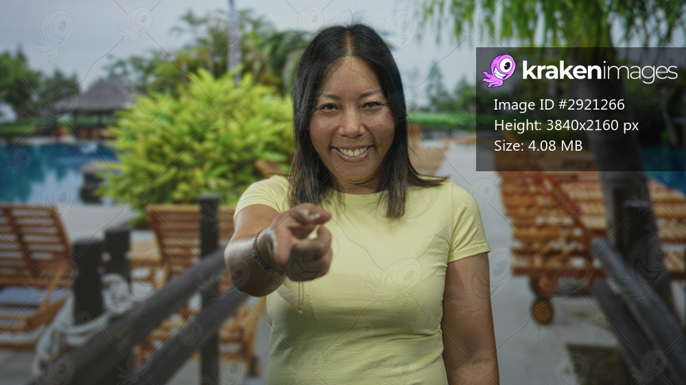 Woman points finger at camera with clenched fist near chest on pool deck outdoors resort seating and palm trees in view; playful confidence.