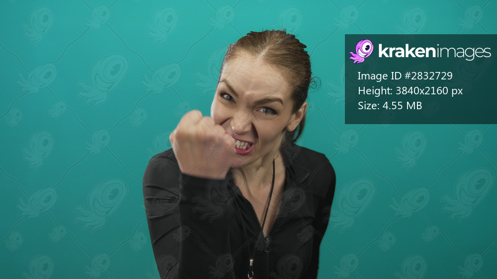 Woman points finger at camera and clenches fist in studio against teal backdrop while wearing a coach whistle; anger.