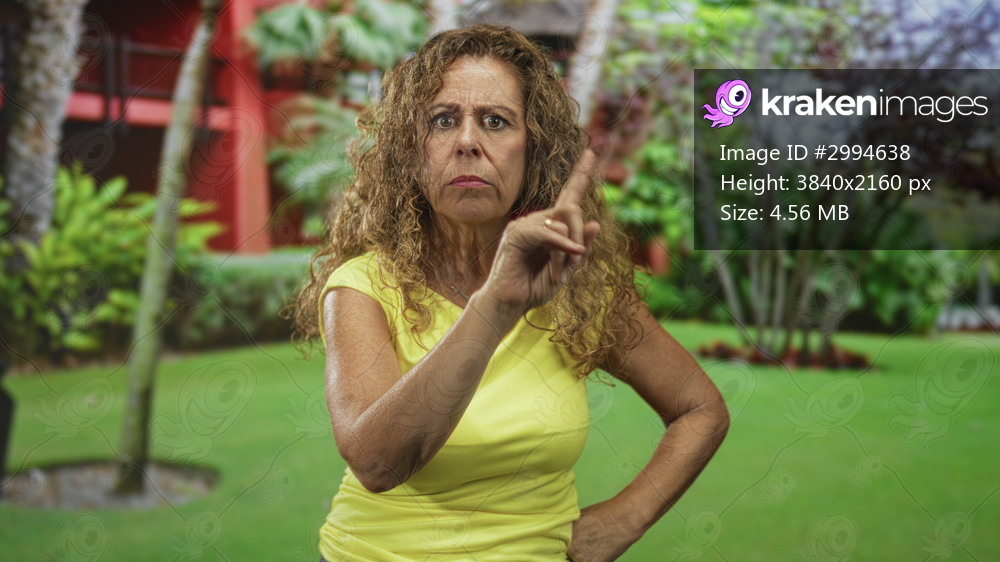 Woman points finger at camera with hand on hip in front of building, yellow shirt and curly hair, stern frown visible; anger warning.