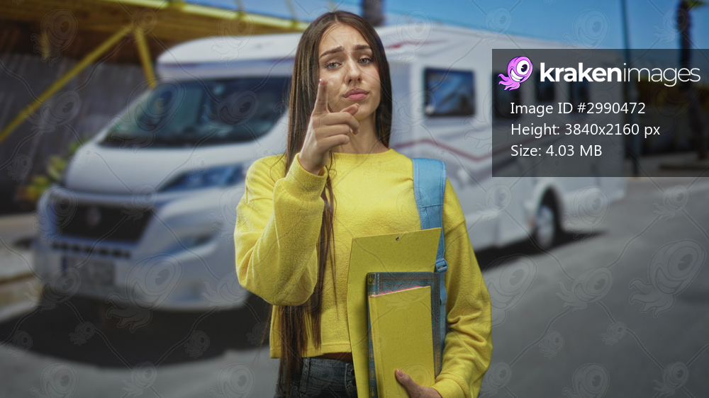 Woman points finger at camera holding yellow folder and backpack on street by motorhome; defiance determination.