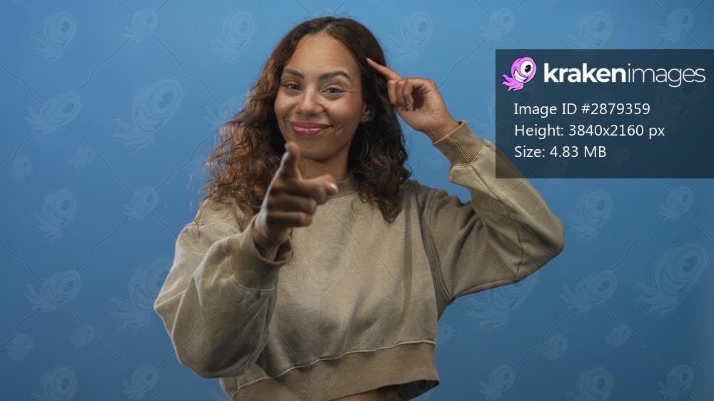 Woman points finger at camera in blue studio while smiling and aiming hand; confidence connection trust.