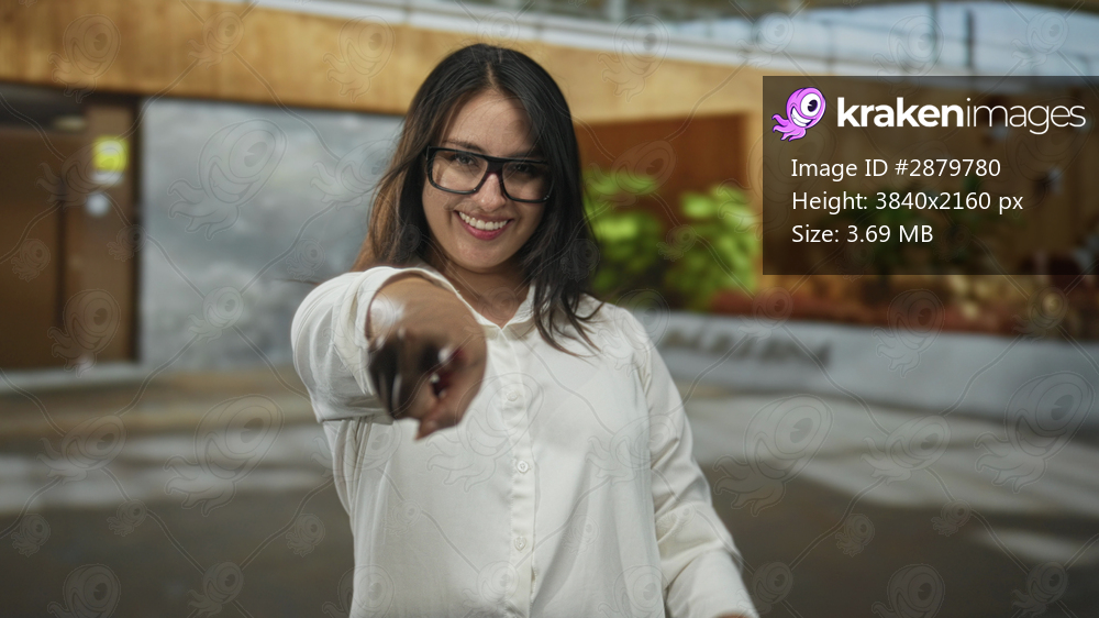 Woman points finger at camera in building entrance, smiling with hand extended and glasses visible; playful confidence and approachability.