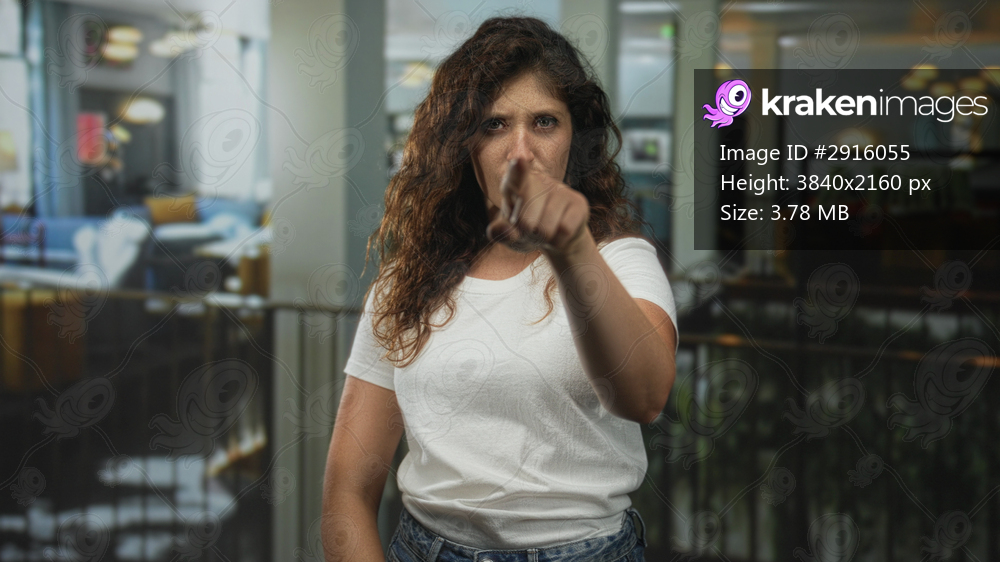 Woman points finger at camera in hotel lobby with stern gaze and extended arm, white t shirt visible; accusation.