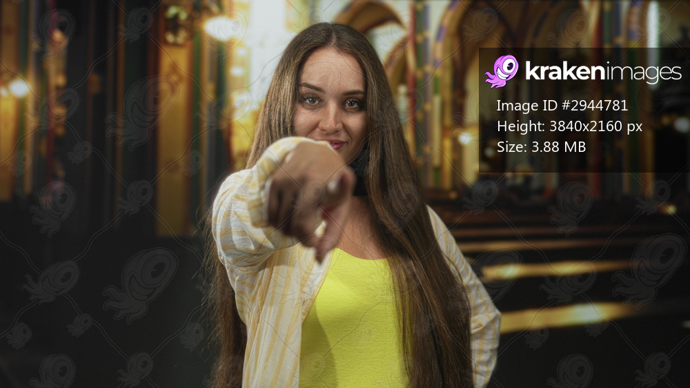 Woman points finger at camera inside church building near pews wearing yellow top; confidence empowerment challenge.