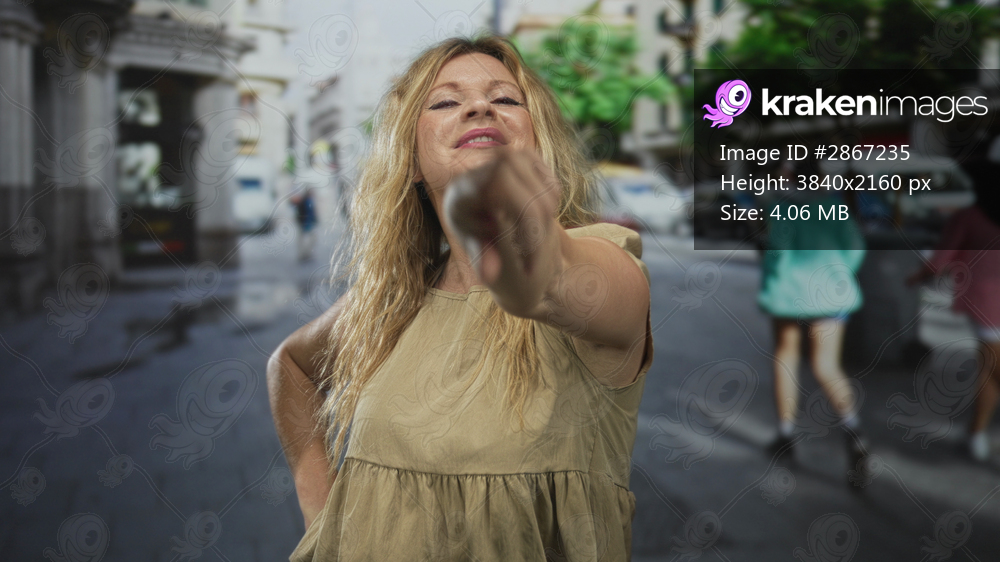 Woman points finger at camera on a city street with hand on hip and visible bare hand; playful confidence.
