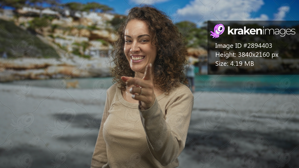 Woman points finger at camera on a sandy beach with seaside cliffs and turquoise water, smiling and engaging; joy playfulness.