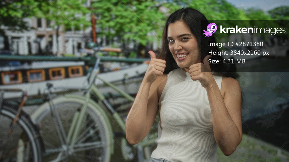 Woman points finger at camera on a street in amsterdam by a canal with parked bicycle, wearing sleeveless top and smiling broadly; excitement.