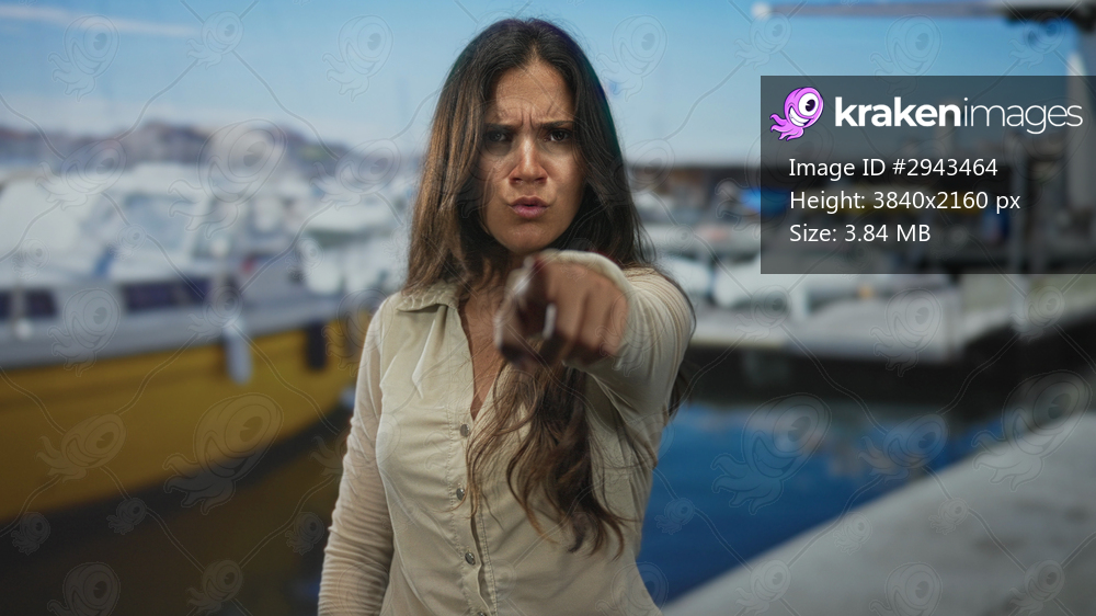 Woman points finger at camera with outstretched hand and stern expression on street near boat dock; anger confrontation.