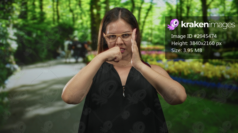 Woman points finger at camera and presses fist in front of her on forest path, wearing glasses and black sleeveless top; determination.