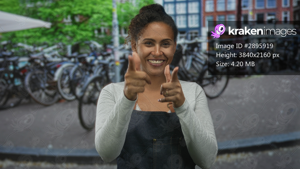 Woman points finger at camera showing hands and smile on street with parked bicycles and canal houses in amsterdam; playful confidence.