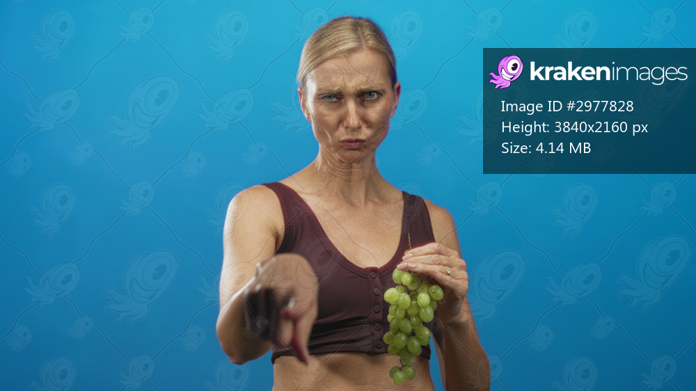 Woman points finger at camera while holding a bunch of green grapes in a blue studio wearing a maroon sports bra; disapproval caution.
