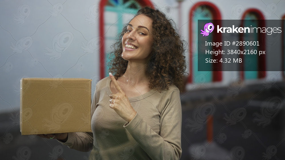 Woman points finger at cardboard box while holding it by chest near arched doors on a street; happiness delivery business.