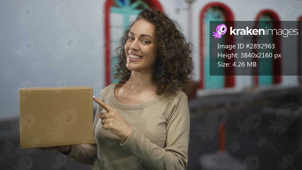 Woman points finger at cardboard box while holding it by chest near arched doors on a street; happiness delivery business.