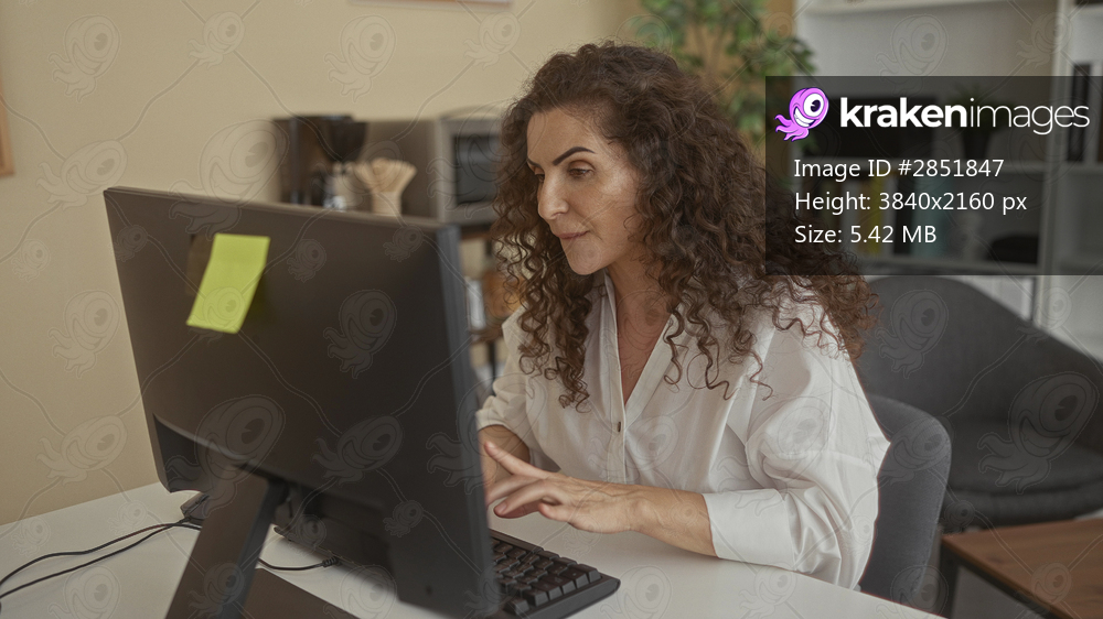 Woman points finger at computer monitor and keyboard while seated at white desk in office workspace; contemplation.