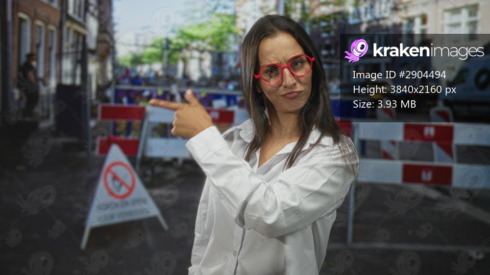 Woman points finger at construction site roadblock wearing red glasses and white shirt; joy discovery.
