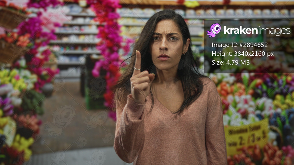 Woman points finger at flower display in street market while hand rests on hip and furrowed brow; frustration confrontation.