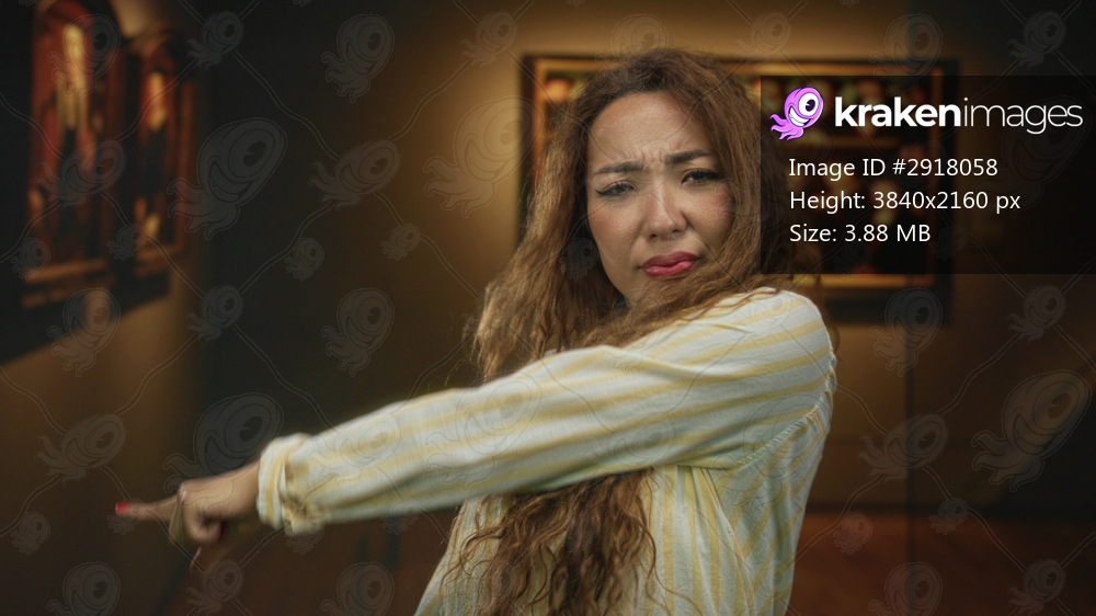 Woman points finger at painting in gallery building, frowning and turning away from the artwork with a dismissive expression; disapproval critique.