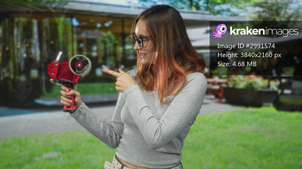 Woman points finger at red handheld tape dispenser while smiling in outdoor cafe street, holding label gun and showing product; playful promotion.
