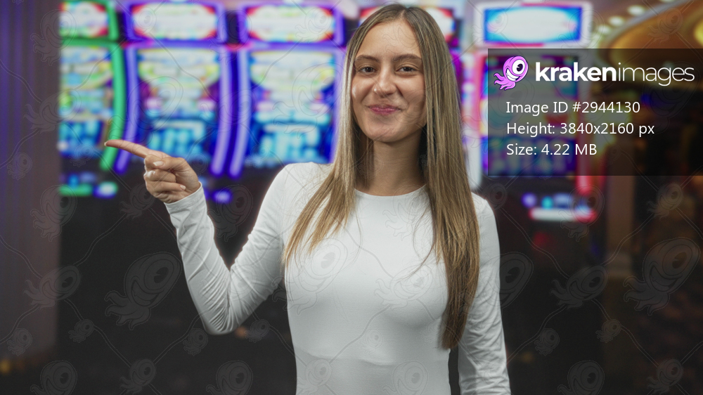 Woman points finger at slot machines on a casino gaming floor, smiling and gesturing toward a machine; playful anticipation.