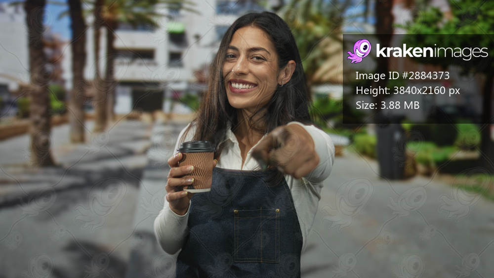 Woman points finger at viewer while holding takeaway coffee cup wearing denim apron on street; welcoming local cafe.