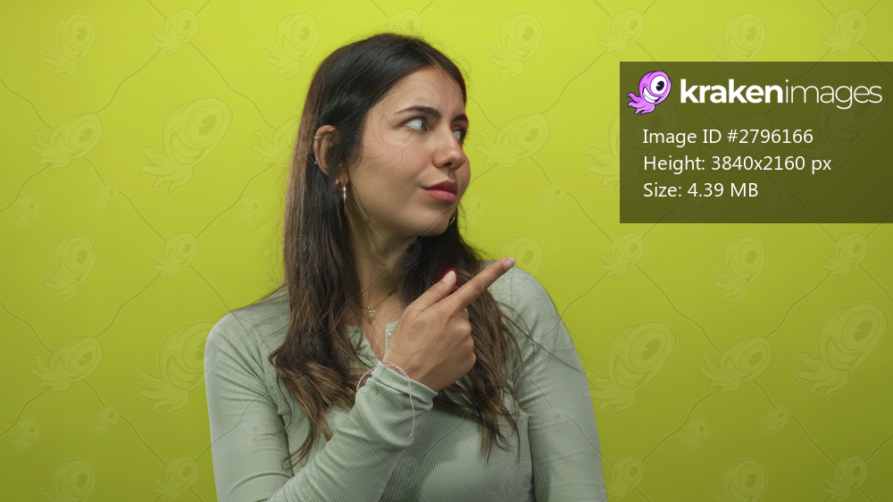 Woman points finger both ways against a yellow studio wall while glancing sideways with a contemplative expression; uncertainty.