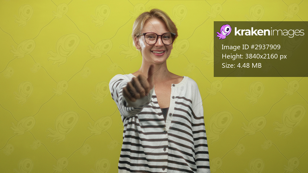 Woman points finger directly at camera in yellow studio wearing striped cardigan and glasses, smiling and engaging; friendly approval.