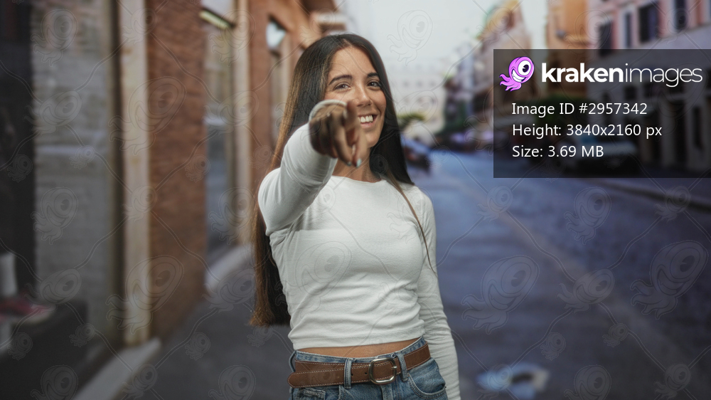 Woman points finger directly at camera on cobblestone street with buildings and parked cars, smiling in white top and jeans; friendly confidence.