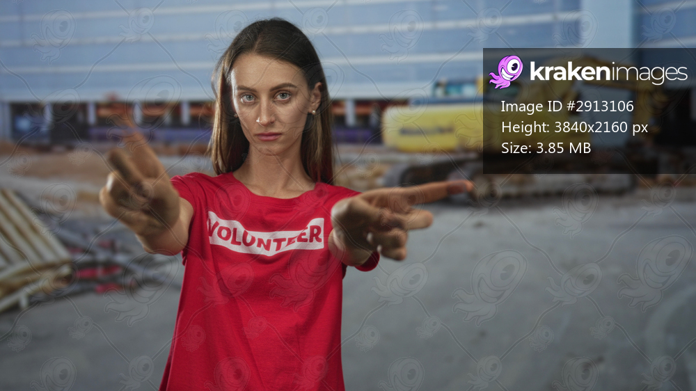 Woman points finger forward at construction site in red volunteer tshirt; determination volunteer service.
