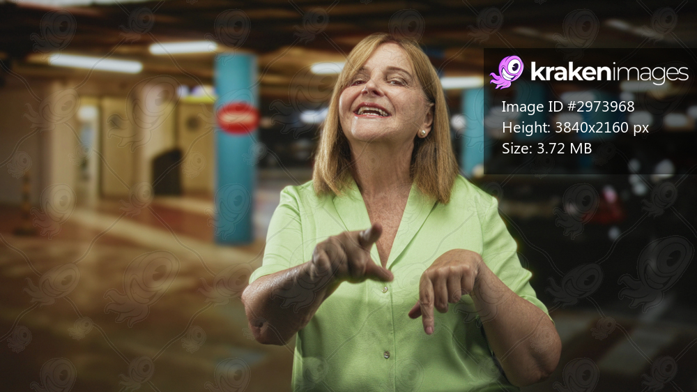 Woman points finger forward with both hands visible, smiling in an indoor parking garage among cars and pillars; cheerful greeting.