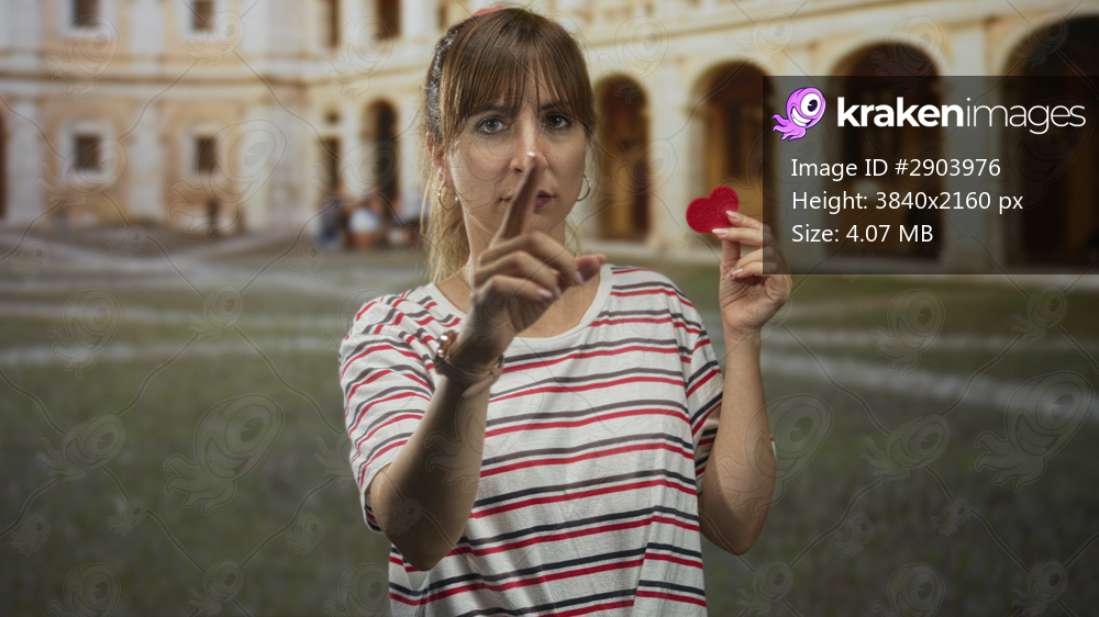 Woman points finger forward holding small red felt heart beside arches of old town building courtyard wearing striped shirt and hoop earrings; love attention focus. - Kraken Images