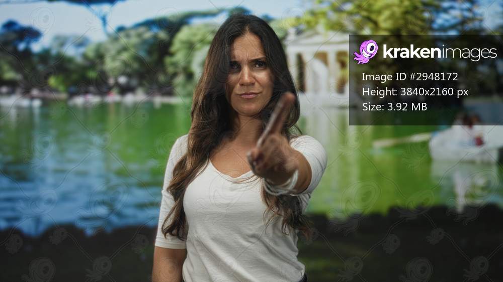 Woman points finger forward in forest, visible hand extended wearing white shirt and long hair; anger confrontation.