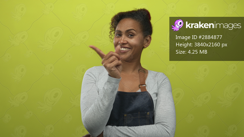 Woman points finger forward in lime green studio wearing denim apron and smiling; confidence persuasion.