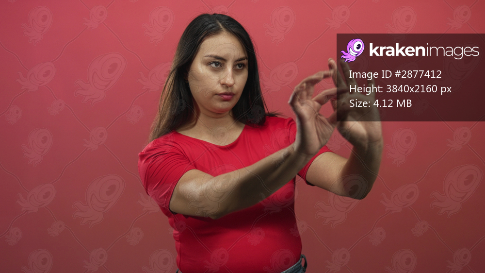 Woman points finger forward in studio amid red backdrop, visible index finger and raised arm, wearing red shirt; concentration.