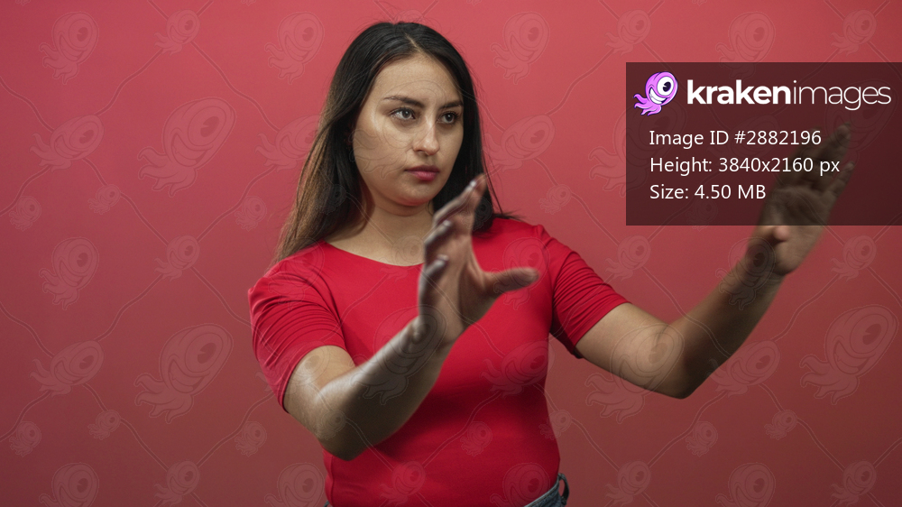 Woman points finger forward in studio amid red backdrop, visible index finger and raised arm, wearing red shirt; concentration.